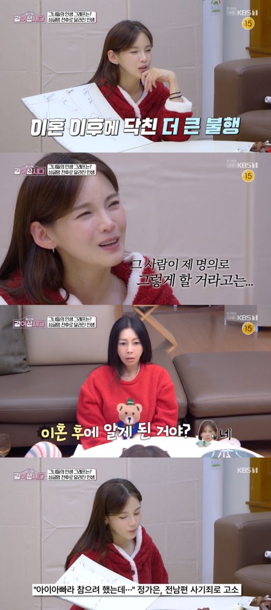 황신혜는 “그걸 이혼 후에 안 거야?”라고 물었고, 정가은은 “네. 그래서 저도 급하게 이사람을 고소를 했다”고 설명했다. 황신혜는 “그건 진짜 상상도 못할 사건이다”고 고통을 공감했고, 장윤정은 “이혼도 힘든 일인데, 그 뒤에 그런 식으로 계속 데미지가 오면..”이라고 걱정했다.
