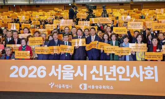 7일 서울 중구 대한상공회의소에서 열린 ‘2026 서울시 신년인사회’에서 오세훈 서울시장(가운데 오른쪽)과 최태원 대한상공회의소 회장(〃 왼쪽) 등 참석자들이 새해 희망 퍼포먼스를 하고 있다. 서울시는 행사 후 종로구 한 호텔에서 주한 외교사절과 신년간담회를 열었다. 최상수 기자 ⓒ 세상을 보는 눈, 세계일보