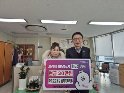 아랑고고장구 김해북부지부(회장 김미숙)는 7일 북부동행정복지센터를 방문해 어려운 이웃을 위한 성금 30만원을 기탁하였다고 밝혔다.