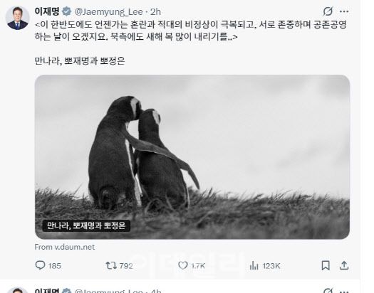7일 귀국길에 이 대통령은 SNS를 통해 “한반도에도 언젠가는 혼란과 적대의 비정상적 상황이 극복되고, 서로 존중하며 공존공영하는 날이 올 것”이라고 적었다. 이어 “북측에도 새해 복 많이 내리기를”이라며 “만나라, 뽀재명과 뽀정은”이라는 문구를 덧붙였다.