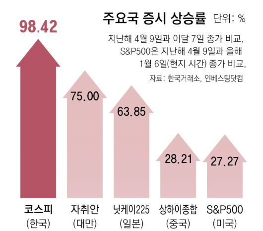 글로벌 증시가 강세를 이어가는 가운데 한국 증시는 ‘코리아 디스카운트’ 해소 기대감이 맞물려 더 큰 폭의 상승세를 보였다. 지난해 4월 트럼프 대통령이 상호관세 방침을 밝힌 여파로 글로벌 증시가 급락했던 지난해 4월 9일 코스피 종가는 2,293.7까지 하락했다. 9개월 만에 2,257.36포인트(98.4%)나 상승하며 두 배로 올랐다. 상장기업 시가총액도 같은 기간 1880조 원에서 2배인 3759조 원으로 불어났다. 이 기간 코스피의 상승 폭은 같은 기간 일본 닛케이225 평균주가(67%), 대만 자취안지수(75%)보다 두드러진다.