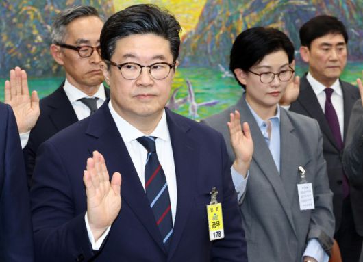 [서울=뉴스핌] 최지환 기자 = 김병주 MBK파트너스 회장이 14일 오후 서울 여의도 국회 정무위원회에서 열린 공정거래위원회, 개인정보보호위원회 등 국정감사에서 증인선서를 하고 있다. 2025.10.14 choipix16@newspim.com |