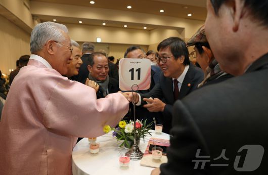(서울=뉴스1) 김진환 기자 = 최휘영 문화체육관광부 장관이 7일 서울 서초구 예술의전당 음악당 콘서트홀에서 열린 2026 신년음악회 시작에 앞서 사전 환담장을 찾아 참석자들과 인사를 나누고 있다. (문화체육관광부 제공, 재판매 및 DB 금지) 2026.1.7/뉴스1