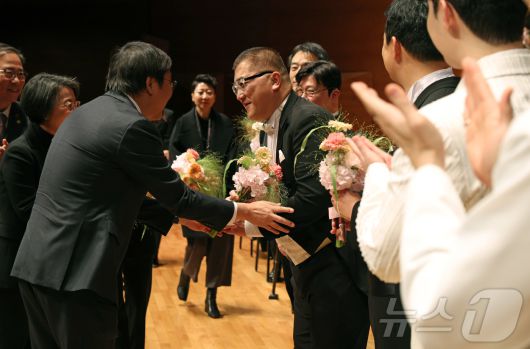 (서울=뉴스1) 김진환 기자 = 최휘영 문화체육관광부 장관이 7일 서울 서초구 예술의전당 음악당 콘서트홀에서 열린 2026 신년음악회를 마친 뒤 출연진들을 격려하고 있다. (문화체육관광부 제공, 재판매 및 DB 금지) 2026.1.7/뉴스1