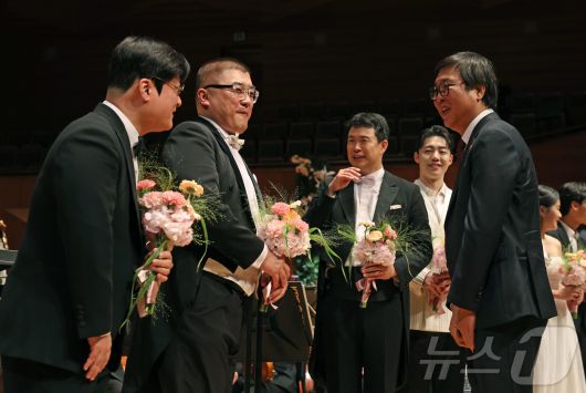 (서울=뉴스1) 김진환 기자 = 최휘영 문화체육관광부 장관이 7일 서울 서초구 예술의전당 음악당 콘서트홀에서 열린 2026 신년음악회를 마친 뒤 출연진들을 격려하고 있다. (문화체육관광부 제공, 재판매 및 DB 금지) 2026.1.7/뉴스1kwangshinQQ@news1.krCopyright ⓒ 뉴스1. All rights reserved. 무단 전재 및 재배포, AI학습 이용 금지.