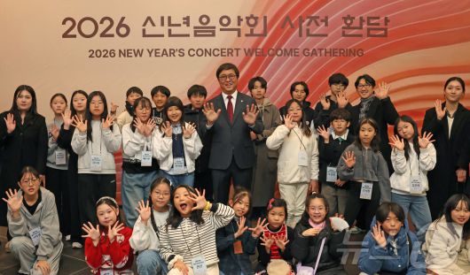 (서울=뉴스1) 김진환 기자 = 최휘영 문화체육관광부 장관이 7일 오후 서울 서초구 예술의전당 음악당 콘서트홀에서 열린 2026 신년음악회에 앞서 열린 사전 환담장에서 인천 서구와 서울 성동구의 꿈의 오케스트라 어린이들을 만나 기념 촬영을 하고 있다. (문화체육관광부 제공, 재판매 및 DB 금지) 2026.1.7/뉴스1