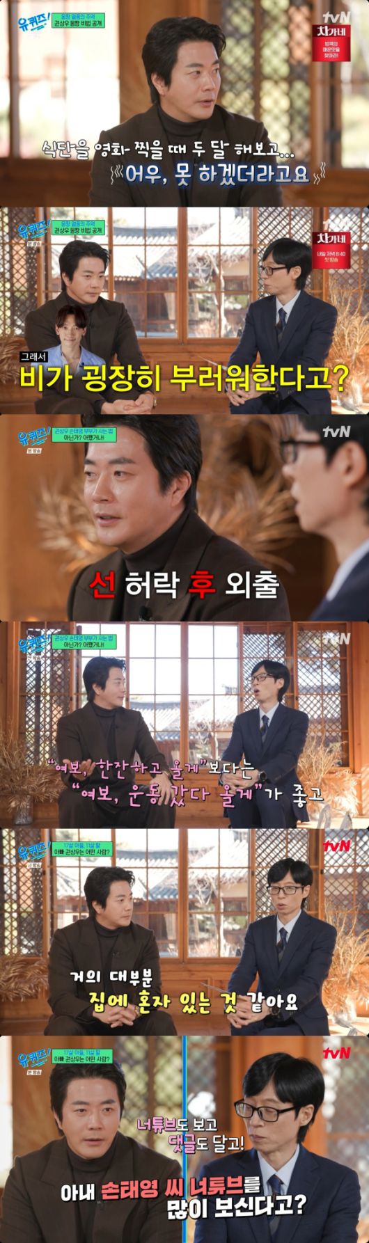 원조 '몸짱'이기도 한 권상우는 "사실 먹을 거 다 먹는다. 영화 찍을 때 식단 두 달 해보고 못하겠더라"라고 털어놨다. 특히 절친 비가 부러워하는 체질이라며 "우리 둘 다 운동만 하니까 1등 신랑감이라고 한다"고 밝혔다. 이에 유재석이 "손태영, 김태희도 같은 생각이냐"고 묻자 권상우는 "운동한다고 하면 잘 보내준다"고 답했다.