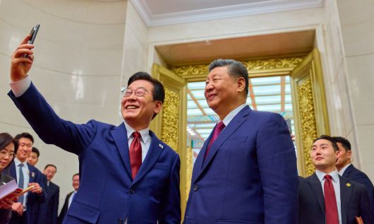 이재명 대통령과 시진핑 중국 국가주석이 5일 중국 베이징 인민대회당에서 국빈만찬 후 샤오미폰으로 기념촬영을 하고 있다. 이 샤오미폰은 경주 정상회담 때 시 주석이 이 대통령에게 선물한 것이다. 공동취재사진 |