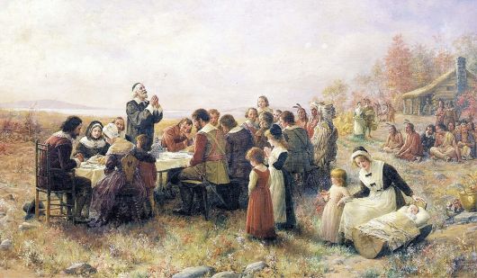 필그림 홀 박물관화가 제니 오거스타 브라운스컴이 1914년에 그린 ‘플리머스에서 첫 번째 추수감사절’. 1621년 매사추세츠 플리머스 식민지에서 열린 첫 번째 추수감사절 장면을 묘사했다. |