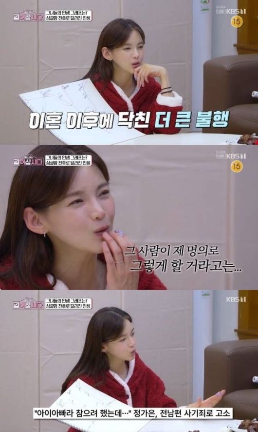 정가은은 7일 첫 방송한 KBS 1TV '황신혜의 같이 삽시다'에서 인생 그래프로 삶을 돌아봤다. "서른 아홉 살에 딸을 낳았을 때 가장 행복했는데, 1년 만에 갑자기 훅 떨어진다. 이혼을 선택했다"면서 "이혼도 힘들었지만 1~2년 후 더 안 좋은 일이 있었다. 그 사람(전 남편)이 내 명의로 그렇게 할 거라고 상상도 못 했다. 이혼 후 알게 됐고, 급하게 고소했다"며 울먹였다.