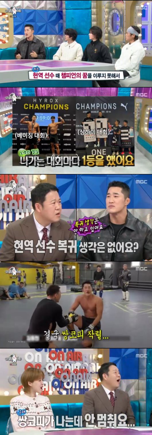 이어 "현역 때 챔피언 벨트도 없고 해서 계속 도전하고 있다. 3번 나갔는데 3번 다 1위를 했다"고 말했고, 이에 김구라는 파이터로서 현역 복귀 생각은 없는지 물었다.