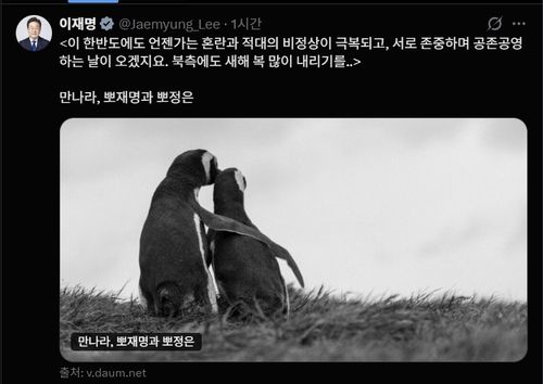 이 대통령은 "한반도에도 언젠가는 혼란과 적대의 비정상이 극복되고 서로 존중하며 공존공영하는 날이 올 것"이라면서 "북측에도 새해 복 많이 내리기를"이라고 전했습니다.