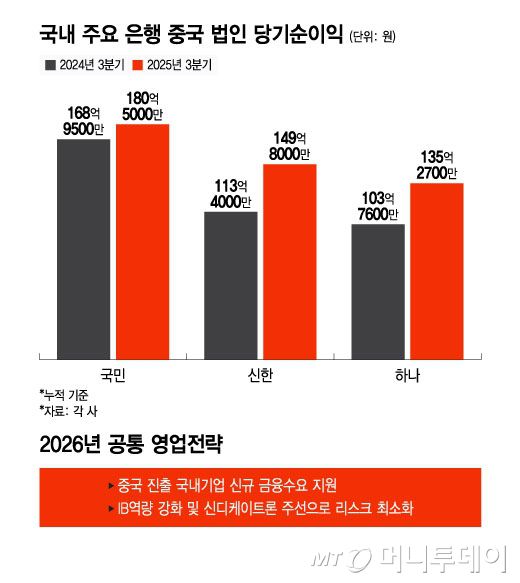 7일 금융권에 따르면 KB국민은행 중국법인의 지난해 3분기 누적 기준 당기순이익은 180억5000만원으로 2024년 같은 기간 대비 6.8% 증가한 것으로 나타났다. 신한은행 중국법인의 당기순이익은 149억8000만원으로 32% 성장했고 하나은행 중국법인도 135억2700만원으로 30% 가까이 늘었다.