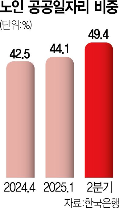 실제로 한국 고용시장에서 공공 부문 고용은 노인일자리와 공공행정 취업자를 중심으로 지난 수년간 빠르게 늘어났다. 공공일자리는 2015년 월평균 113만 명에서 2025년 1~3분기 208만 명으로 확대됐고 전체 취업자 대비 비중도 같은 기간 4.3%에서 7.2%로 상승했다. 공공일자리의 절반가량은 노인 일자리로 구성돼 있다. 노인 일자리는 월평균 기준 2015년 27만 명에서 2025년 1~3분기 99만 명으로 3.7배 급증했다.