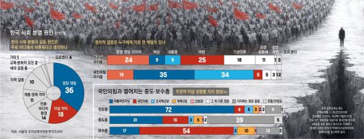 7일 서울대 국가미래전략원·경향신문·중앙일보가 공동 기획하고 한국리서치에 의뢰해 지난해 12월 29~31일 전국 성인 3000명을 대상으로 웹조사를 실시한 결과를 보면, 한국 사회 분열과 갈등의 주요 원인으로 ‘정당 대립’을 꼽은 응답(36%)이 가장 많았고, 이념 대립(18%)이 그 뒤를 이었다. 응답자 절반 이상이 정치를 주요 갈등 원인으로 인식한 셈이다. 더불어민주당 지지자(34%)와 국민의힘 지지자(42%) 모두 정당 대립을 1순위로 꼽았다.