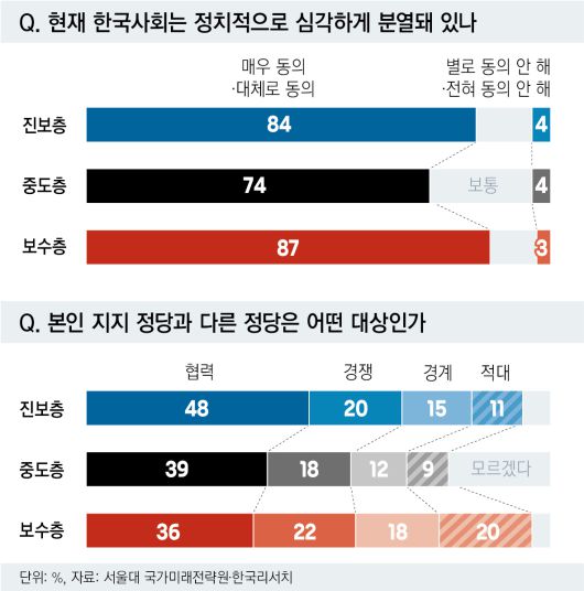 시민들은 사회 분열의 주된 원인으로 정당 대립(36%)과 이념 차이(18%)를 1·2위로 지목하며 한국 사회의 통합이 정치의 복원에서 시작해야 한다고 답했다. 자신이 지지하는 정당과 다른 정당에 대해 ‘협력 대상’(41%)이라 보는 응답이 가장 많았다. ‘적대 대상’이라는 응답은 13%에 그쳤다. 진보층(48%), 중도층(39%), 보수층(36%) 모두 협력 대상이라는 응답이 가장 많았다. 자신이 지지하지 않는 정치 세력이 집권해도 국가 발전에 해가 되지 않는다는 응답은 38%였다. 국가 발전을 해친다는 응답은 27%에 그쳤다.
