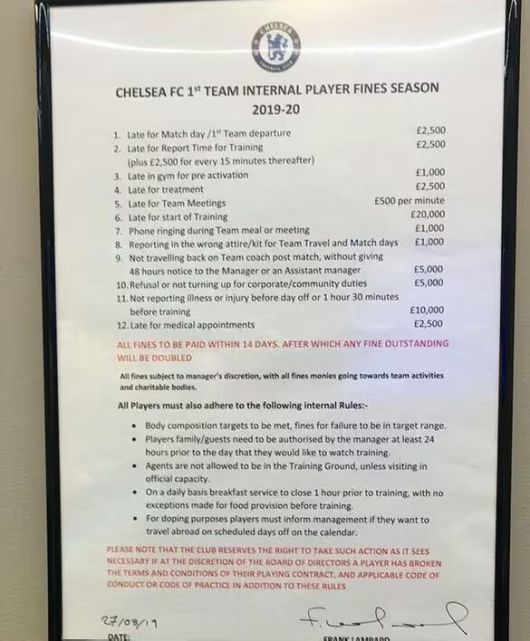 과거 첼시 1기 시절, 램파드 감독의 벌금표가 유출돼 화제가 된 적이 있다. 2019~2020시즌 첼시를 이끌던 램파드 감독은 선수들에게 벌금표를 공지했다. 각 항목을 지키지 않았을 경우에 적지 않은 벌금을 내야 하고, 그 벌금은 선수단 전체나 기부를 위해서 쓰인다고 공지했다.