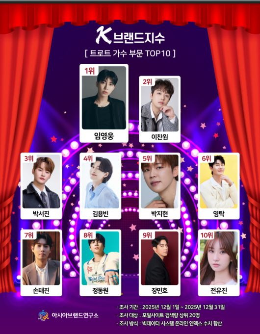 류원선 아시아브랜드연구소 리서치센터장은 "이번 K-브랜드지수 트로트 가수 부문은 임영웅·이찬원 양강 구도가 확고해진 가운데, 신구 가수들의 세대 교체 양상이 두드러진 것이 특징이다. 상위권 가수들이 상당수 유지된 점은 강한 팬덤 기반과 대중 인지도가 견고하게 작동하고 있음을 보여주는 상황"이라고 평가했다.
