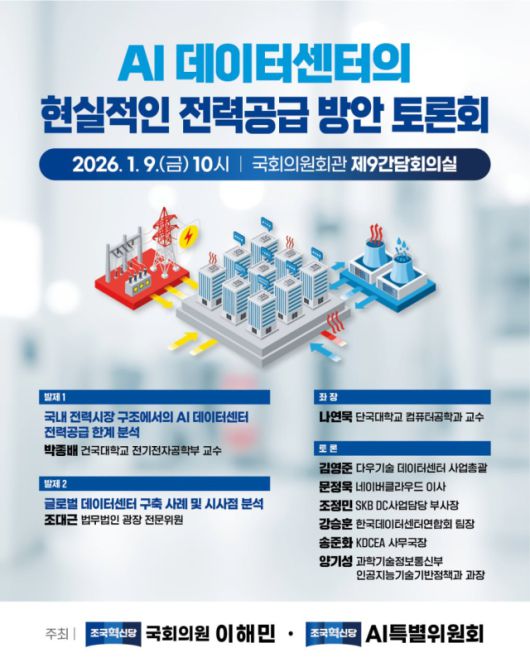 이해민 의원은 “지금과 같은 전력 공급 구조와 인허가 속도로는 AI 경쟁에서 뒤처질 수밖에 없다”며 “이번 토론회를 통해 단순히 ‘해야 한다’는 당위성을 확인하는 데 그치지 않고, ‘어떻게 해야 한다’는 현실적이고 구체적인 전력 공급 해법까지 도출하겠다”고 말했다.