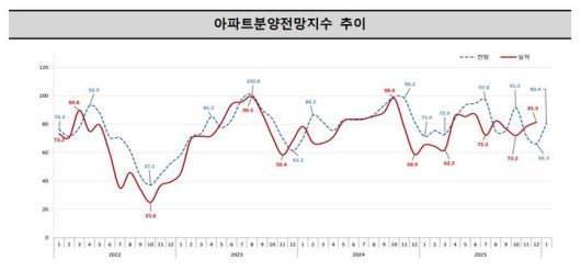 주산연은 "분양전망 지수가 여전히 기준치(100)를 밑돌고 있어 분양전망이 긍정적이라고 보긴 어렵지만, 추가 악화에 대한 우려는 전월 대비 완화된 것으로 보인다"고 밝혔다.