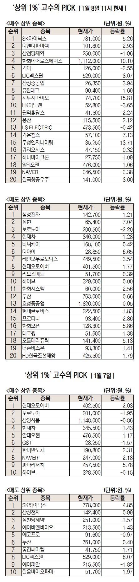 미래에셋증권에 따르면 자사 주식 거래 고객 가운데 최근 1개월간 투자 수익률 상위 1퍼센트에 해당하는 주식 초고수들이 이날 오전 11시까지 가장 많이 사들인 종목은 SK하이닉스다. 반면 가장 많이 파는 종목은 삼성전자(005930)로 국내 주식 투톱에 대한 매매가 엇갈린 양상이다.
