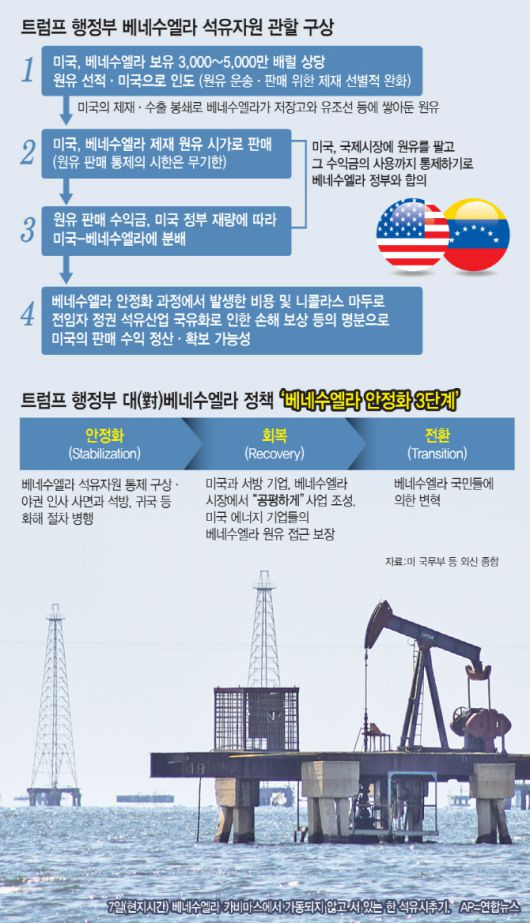 소식통들은 트럼프 행정부는 베네수엘라 국영 석유회사인 페트롤레오스 데 베네수엘라(PDVSA)에 대해 미국이 일정 수준의 통제권을 행사하는 방안을 검토 중이라고 말했다. 여기에는 PDVSA의 석유 생산량 대부분을 확보해 직접 판매·유통하는 구상도 포함돼 있다. 이 계획이 성공한다면 미국은 미국이 생산을 통제하는 다른 국가의 매장량까지 포함해 사실상 서반구 대부분의 석유 매장량을 관리·감독하는 자리에 오르게 된다. 이는 베네수엘라에서 중국과 러시아의 영향력 축소, 미국 소비자의 에너지 가격 인하로 이어질 수 있다. 둘 다 트럼프 행정부의 핵심 목표에 해당한다.
