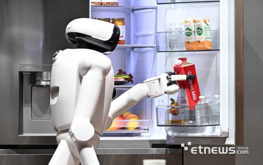 라스베이거스 컨벤션센터 센트럴홀에 마련된 LG전자 부스에서 인공지능(AI) 홈로봇 클로이드가 냉장고에서 우유를 꺼내들고 있다. |