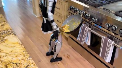 가정집 부엌으로 로봇이 들어오는데, 앞치마를 한 로봇이 벌렁 넘어지고요.