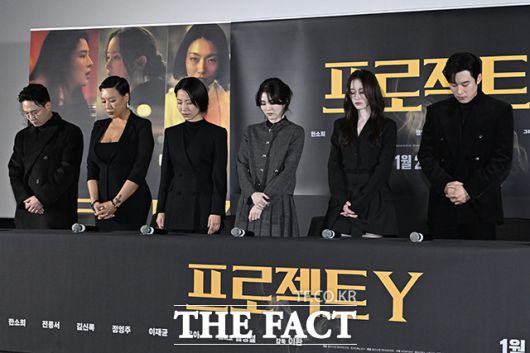 [더팩트ㅣ송호영 기자] 이환 감독과 배우 정영주, 김신록, 한소희, 전종서, 김성철(왼쪽부터)이 8일 오후 서울 송파구 롯데시네마 월드타워에서 열린 영화 '프로젝트Y' 기자간담회에 앞서 지난 5일 타계한 배우 안성기를 위해 묵념하고 있다.