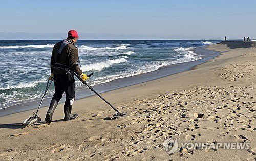 (강릉=연합뉴스) 유형재 기자 = 8일 강원 강릉시 한 해변 백사장에서 주민이 금속 탐지기를 이용해 금붙이 등을 찾고 있다.