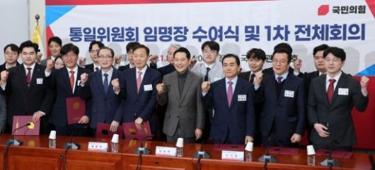 장동혁 국민의힘 대표가 8일 국회에서 열린 통일위원회 임명장 수여식에서 김기웅 위원장을 비롯한 위원들과 기념촬영을 하고 있다. <ⓒ투자가를 위한 경제콘텐츠 플랫폼, 아시아경제(www.asiae.co.kr) 무단전재 배포금지>