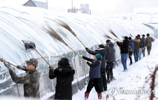 폭설에 비닐하우스 제설. 연합뉴스 |