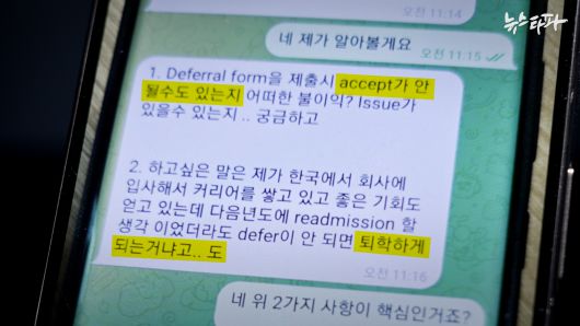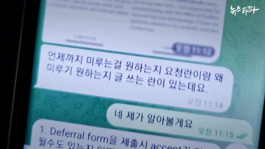 차남 김 씨의 메시지는 계속 이어졌다. 그는 A씨에게 "Deferral form(휴학 신청 양식)을 제출하면 accept(수락)이 안 될 수도 있는지, 어떠한 불이익 issue(문제)가 있을 수 있는지 궁금하다"며 "defer(휴학)이 안 되면 퇴학하게 되는지도 (궁금하다)"라는 메시지를 보냈다. 자신이 대학 측에 문의해도 될 사안을 A씨에게 물었던 것이다.