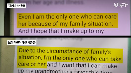 A씨는 잠시 뒤 해당 영작문의 문법 오류 등을 수정해 다시 차남 김 씨에게 전송했다. "Even I am the only one who can care her"라고 되어 있는 문장을, "I'm the only one who can take care of her" 형태로 수정했다. 이 과정에서 어색한 영어식 표현을 매끄럽게 다듬기도 했다.