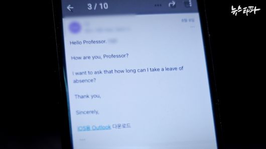 당시 휴학 중이었던 김 씨는 A씨에게 자신이 미국 켄터키대학 측과 나눈 이메일을 캡쳐해서 보낸다. 미국 대학의 휴학을 연장해야 하는 상황에서 A 씨에게 조언을 구한 것이다.