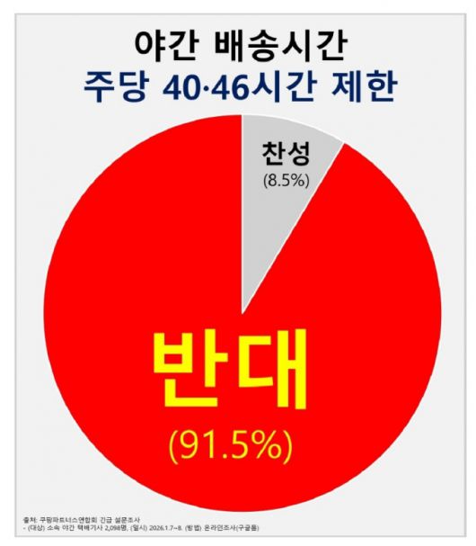 쿠팡 택배 영업점 단체인 쿠팡파트너스연합회(CPA)가 지난 6~7일 소속 택배 기사 2098명을 대상으로 긴급 설문조사를 실시한 결과 응답자의 91.5%가 야간 배송 시간을 주당 40~46시간으로 제한하는 것에 반대했다.
