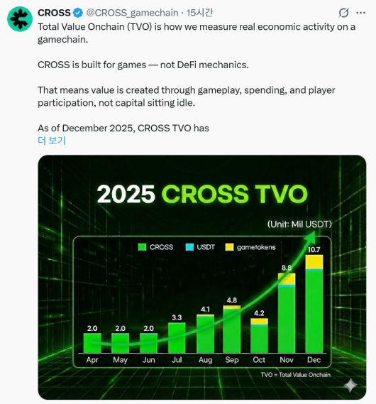 크로쓰는 8일 SNS 채널을 통해 TVO를 '게임체인에서 발생하는 실제 경제 활동을 측정하는 지표'로 정의했다. 그러면서 자본 예치 규모를 중심으로 보는 기존 탈중앙화금융(DeFi) 지표와는 다른 기준이 필요하다고 지적했다.
