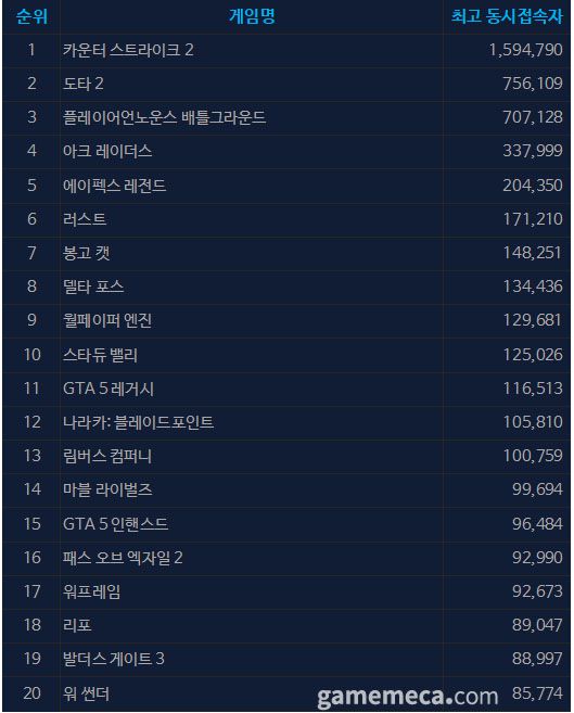 ▲ 1월 8일 오후 4시 기준 스팀 일 최고 동시접속자 TOP 20 (자료출처: 스팀) |