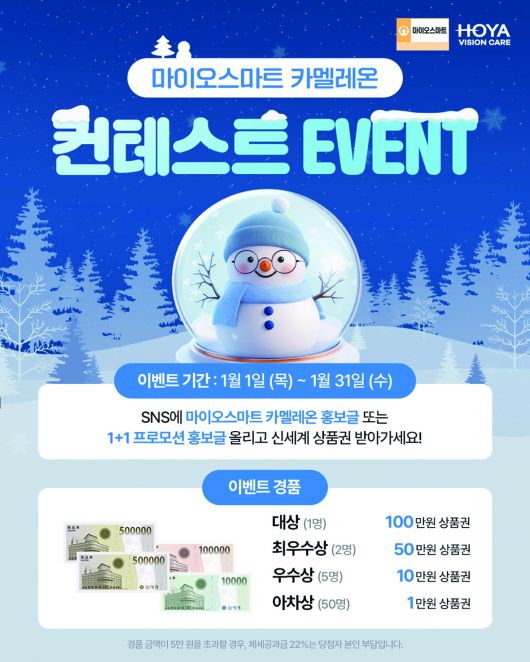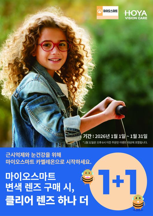한국호야렌즈(대표 정병헌)가 겨울방학을 맞아 아이들 근시 관리 중요성을 알리고 근시억제 시장 활성화를 도모하기 위해 어린이 근시 억제 안경렌즈 '마이오스마트'를 대상으로 1+1 프로모션과 소비자 참여형 이벤트 마이오스마트 카멜레온 콘테스트 이벤트를 함께 진행한다고 최근 밝혔다.
