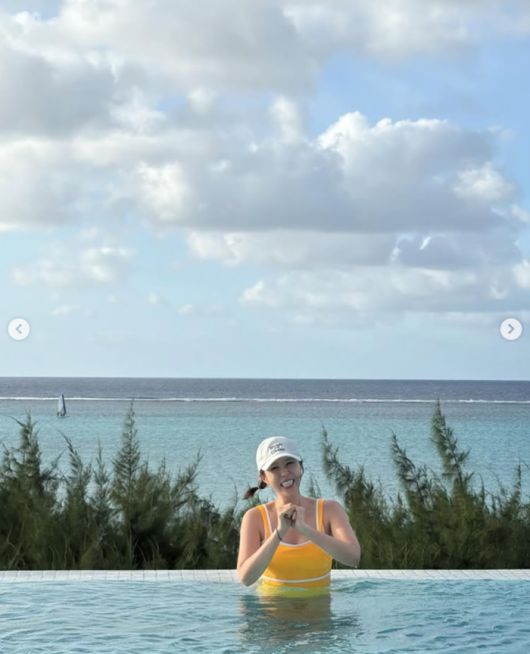 공개된 사진 속 신지는 에메랄드빛 바다가 펼쳐진 인피니티 풀에서 여유로운 시간을 만끽하고 있다. 특히 화사한 노란색 수영복에 화이트 캡 모자를 매치한 그는 특유의 상큼하고 건강미 넘치는 비주얼을 자랑했다. 물속에서 밝게 웃으며 카메라를 응시하거나 손으로 하트를 만드는 모습에서는 즐거운 여행의 설렘이 고스란히 느껴진다.