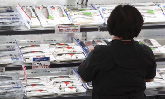최근 고등어 가격이 상승하는 8일 오후 서울 시내의 한 대형마트에서 직원이 수산물 매대에서 생선을 정리하고 있다. 뉴시스 |