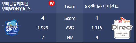 흐름을 탄 우리금융캐피탈은 멈추지 않았다. 승부처였던 3세트 에이스 맞대결에서 '다비드 사파타'가 '강동궁'을 15:12(8이닝)로 제압하며 역전에 성공했고, 4세트 혼합복식에서도 선지훈-김민영 조가 9:4로 승리했다. 기세가 오른 우리금융은 5세트 남자단식에서 강민구가 레펀스를 단 3이닝 만에 11:2로 돌려세우며 경기를 매조지었다. 1세트 패배를 완벽하게 설욕하는 짜릿한 역전승이었다.