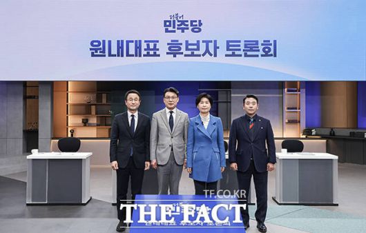 [더팩트ㅣ배정한 기자] 더불어민주당 원내대표 선거에 출마한 한병도·진성준·백혜련·박정 후보(왼쪽부터)가 8일 오후 서울 마포구 상암동 JTBC에서 더불어민주당 원내대표 보궐선거 후보자 합동토론회에 참석해 기념사진 촬영을 하고 있다.