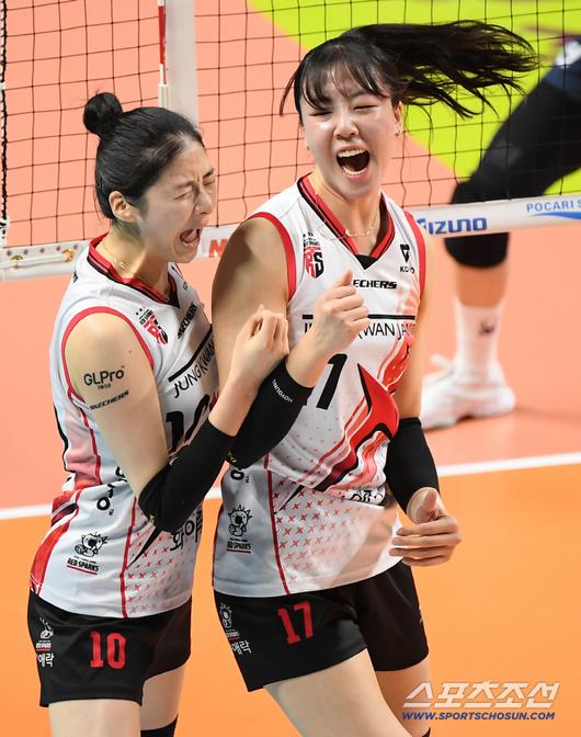 28일 서울 장충체육관에서 열린 V리그 GS칼텍스-정관장전. 정관장 정호영과 박혜민이 GS칼텍스 실바의 공격을 블로킹한 후 환호하고 있다. 장충체=정재근 기자 cjg@sportschosun.com/2025.11.28/ |