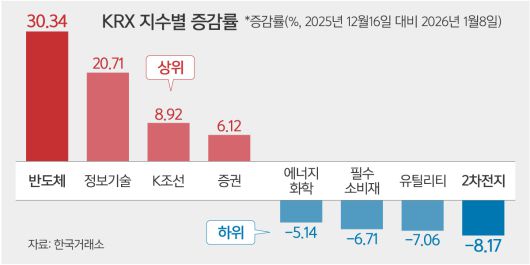 8일 한국거래소에 따르면 지난해 12월 이후 삼성전자와 SK하이닉스, 한미반도체, 원익IPS 등 국내 10대 반도체 제조사가 포함된 KRX반도체 지수는 지난해 12월16일 5656.26에서 이날 7372.28로 장을 마감하며 30.34% 올랐다. 삼성전자와 SK하이닉스가 포함된 정보기술 지수도 같은 기간 20.71%(2384.79→2878.75) 증가해 지수 중 두 번째로 높은 상승세를 보였다. 한화오션과 HD한국조선해양 등 주요 조선주가 모여있는 K조선 TOP10 지수도 이 기간 8.92% 증가했다.