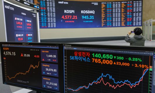 코스피가 장중 4600선을 돌파하며 또 다시 사상 최고치를 기록한 8일 서울 여의도 한국거래소 홍보관 모니터에 삼성전자, SK하이닉스의 현재가가 표시되고 있다. 최상수 기자 |