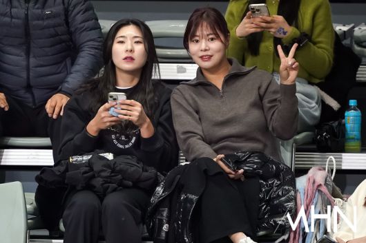 (MHN, 박태성 기자) 8일 서울 장충체육관에서 '2025-2026 V-리그 남자부' 우리카드와 대한항공 경기가 열렸다. 프로골퍼 이지현과 김리안이 열띤 응원전을 펼치고 있다. <저작권자 Copyright ⓒ MHN / 엠에이치앤 무단전재 및 재배포 금지>