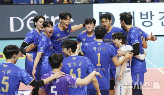 [서울=뉴시스] 김근수 기자 = 8일 오후 서울 중구 장충체육관에서 열린 진에어 2025-26 V-리그 프로배구대회 우리카드와 대한항공의 경기에서 우리카드가 세트 스코어 3-0으로 승리를 거두자 선수들이 기뻐하고 있다. 2026.01.08. ks@newsis.com