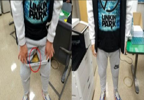 팬티 속에 마약을 숨긴 장면을 재현하는 모습. (사진=부산지검) |