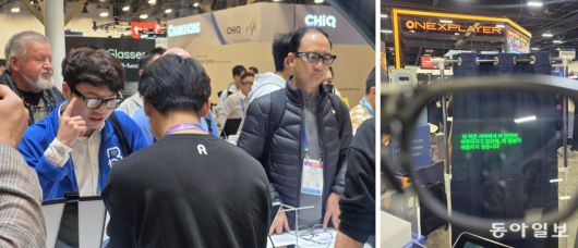 7일(현지 시간) CES 2026이 열린 미국 라스베이거스 컨벤션센터(LVCC) 센트럴 홀에 있는 스타트업 ‘로키드’의 부스에서 관람객들이 줄지어 스마트 안경을 착용해 보고 있다(왼쪽 사진). 스타트업 ‘엑스알에이아이’의 직원이 자사 스마트 안경에 대해 영어로 설명하자 한국어 번역문이 안경에 실시간으로 표시되고 있다. 라스베이거스=박종민 기자 blick@donga.com |